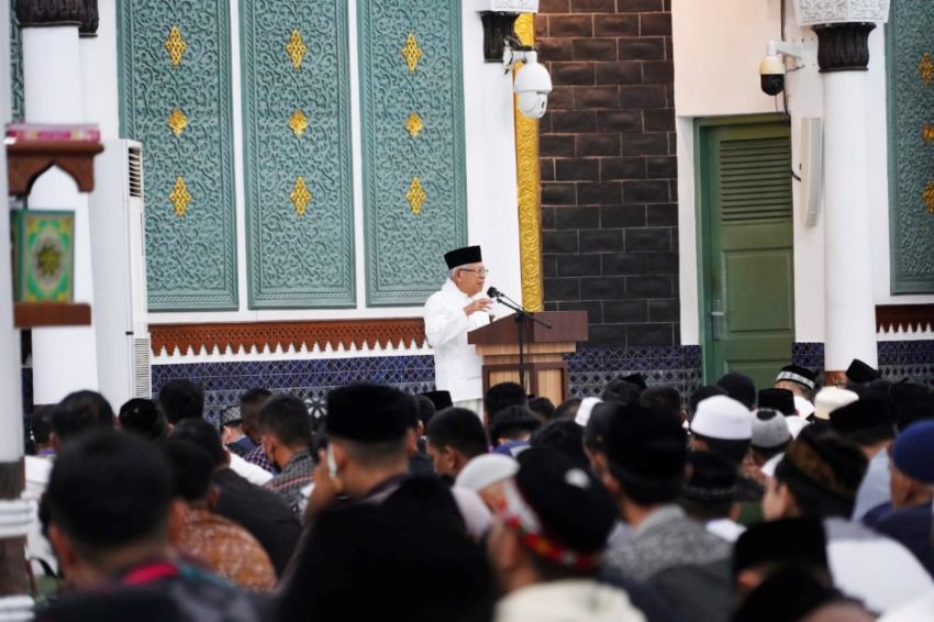 “Yang saya hormati pengurus Masjid Raya Aceh para pejabat para muslimin, muslimat sekalian yang saya hormati. Marilah kita bersyukur kepada Allah SWT karena kita bisa melakukan kembali puasa Ramadan sebulan penuh,” kata Wapres mengawali tausiahnya.